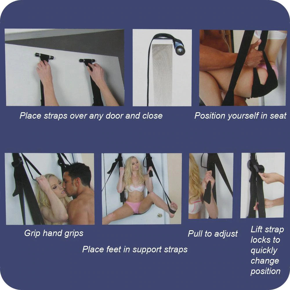 A fantastic sex swing from Fetish Fantasy, the Deluxe version of this great set lets you get into some creatively compromising positions easily and very excitingly. Especially considering all the pleasure you'll get from this sexy system, it's breathtakingly easy to use and requires only a doorway to set up .Overtop of the door, simply place the stopper-ended section of the main straps and close and lock the door. That's it, you're done! A soft padded seat can be adjusted to the ideal height quickly, it pivots perfectly, letting your partner lift and position your hips just right; you can provide leverage to almost any position by utilizing the foot support straps at the bottom and sturdy hand grips up top. This exciting Swing is meant to help your partner support your weight during sexy-time and provide some exciting positioning control- it's not meant to be used as a suspension device, and shouldn't be used alone, nor should you attempt to fully support more than one person. The max supportable weight is 300lbs (136kg). Please be sure to follow the safety instructions included on the box for the safest and most pleasurable experience with the Swing.
